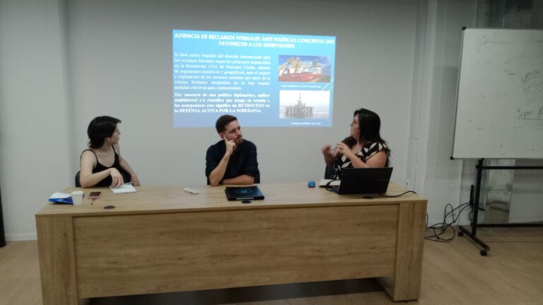 Además, participaron de la mesa Martina Mántaras y Lilián Berardi de la UNR con el tema «La agenda antártica durante la administración de Alberto Fernández (2019-2023). La continua tarea de una Argentina bicontinental.» y el Dr. Rogério do Nascimento Carvalho, representando al Brasil, con «Las narrativas de la iniciativa AUKUS y la expansión de los BRICS: implicaciones para la cuestión Malvinas».