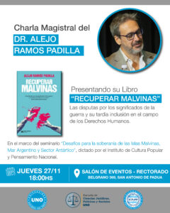 El Dr. Ramos Padilla presentará su libro “Recuperar Malvinas. Las disputas por los significados de la guerra y su tardía inclusión en el campo de los derechos humanos” en el marco del cierre del seminario “Desafíos para la soberanía de las Islas Malvinas, Mar Argentino y Sector Antártico”.