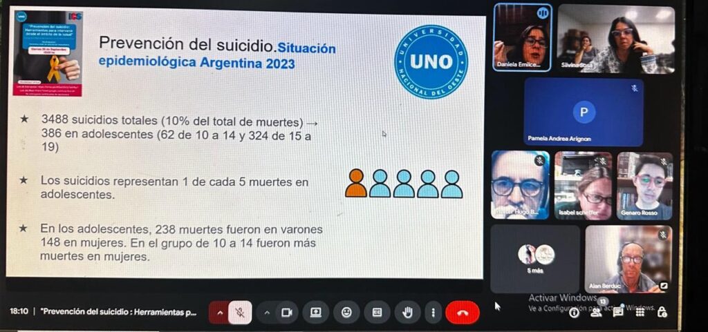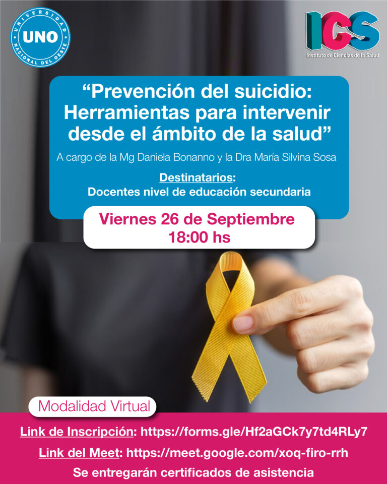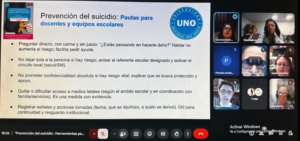 - El Instituto de Ciencias de la Salud de la UNO y el Hospital Interzonal de Agudos «Vicente López y Planes» abordaron la conferencia «Prevención del suicidio: Herramientas para intervenir desde el ámbito de la salud», dictada por docentes de nuestra casa de estudios, la Mg. Daniela Bonanno y la Dra. María Silvina Sosa. Durante el encuentro se abordaron enfoques actuales de prevención, detección temprana, estrategias de intervención interdisciplinaria y protocolos de derivación, integrando evidencia científica con experiencias prácticas en el ámbito clínico y comunitario. Las exposiciones enfatizaron la importancia de la escucha activa, la contención emocional y el trabajo en red entre profesionales de la salud, la educación y los servicios sociales para ofrecer respuestas oportunas y humanizadas.